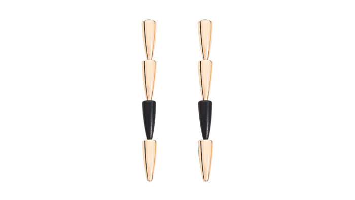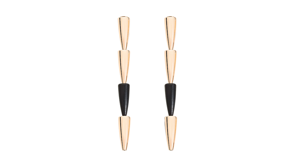 Questi orecchini esprimono tutto il fascino della linea più iconica di Vhernier, che nella ripetizione del singolo elemento Calla moltiplica femminilità ed eleganza casual chic. Modello a clip, semplice ed essenziale, qui proposto nella versione che alterna il classico oro rosa di Vhernier al nero assoluto dell'ebano. Orecchini in oro rosa ed ebano