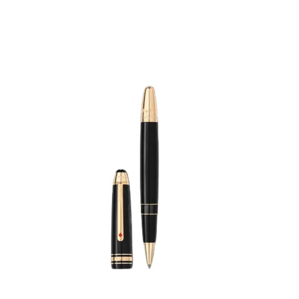 La collezione Meisterstück Around the World in 80 Days si ispira al famoso romanzo di avventura di Jules Verne “Il giro del mondo in 80 giorni”. La roller LeGrand in pregiata resina antracite trae ispirazione dalla seconda tappa del viaggio, da Bombay a Yokohama. In questa seconda tappa avventurosa, i protagonisti viaggiano su un maestoso elefante, che compare in un cartiglio sul cappuccio. La clip presenta un asso di quadri laccato rosso e il cono reca l’incisione di un motivo ispirato ai gioielli della Principessa Auda e ai semi delle carte, che rappresentano la scommessa di Fogg di compiere il viaggio in 80 giorni. La parte superiore del cappuccio presenta la goffratura della durata del viaggio, 25 giorni da Bombay a Yokohama e 80 giorni in totale.