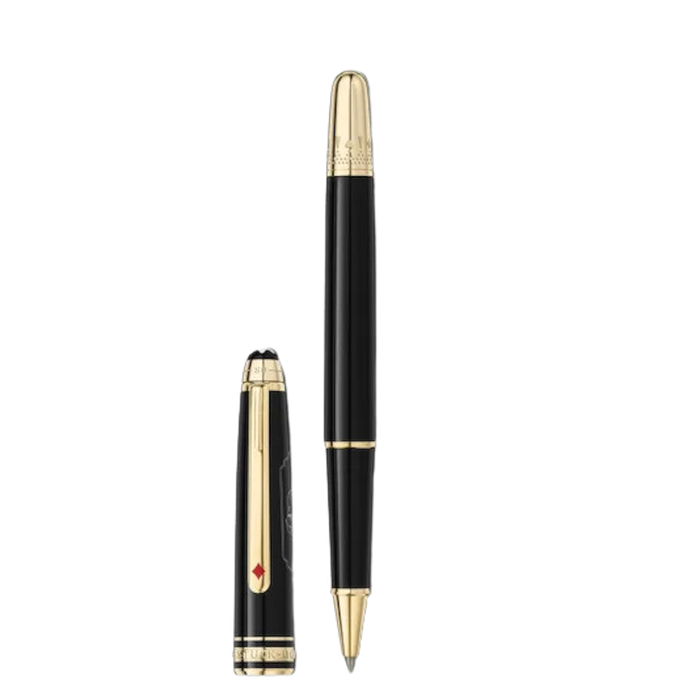 La collezione Meisterstück Around the World in 80 Days si ispira al famoso romanzo di avventura di Jules Verne “Il giro del mondo in 80 giorni”. La roller Classique in pregiata resina antracite trae ispirazione dalla seconda tappa del viaggio, da Bombay a Yokohama. In questa seconda tappa avventurosa, i protagonisti viaggiano su un maestoso elefante, che compare in un cartiglio sul cappuccio. La clip presenta un asso di quadri laccato rosso e il cono reca l’incisione di un motivo e dei semi delle carte, che rappresentano la scommessa di Fogg di compiere il viaggio in 80 giorni. La parte superiore del cappuccio presenta la goffratura della durata del viaggio, 25 giorni da Bombay a Yokohama e 80 giorni in totale.