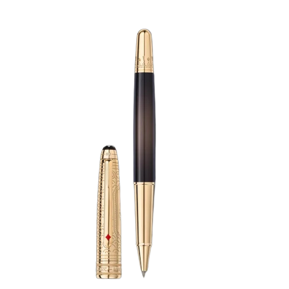 La collezione Meisterstück Around the World in 80 Days si ispira al famoso romanzo di avventura di Jules Verne “Il giro del mondo in 80 giorni”. La roller Doué Classique con cappuccio in metallo finitura oro e corpo in lacca antracite dégradé, trae ispirazione dalla seconda tappa del viaggio, da Bombay a Yokohama. In questa seconda tappa avventurosa, i protagonisti viaggiano su un maestoso elefante, che compare in un cartiglio sul cappuccio. Il cappuccio in metallo finitura oro reca un motivo inciso che simboleggia la fortuna. La clip presenta un asso di quadri laccato rosso e il cono reca l’incisione di un motivo e dei semi delle carte, che rappresentano la scommessa di Fogg di compiere il viaggio in 80 giorni. La parte superiore del cappuccio presenta la goffratura della durata del viaggio, 25 giorni da Bombay a Yokohama e 80 giorni in totale.