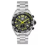 Assapora la vittoria con questo cronografo da corsa da 43 mm: una sferzata di energia con TAG Heuer Formula 1. Vivi il brivido della velocità con questo modello con quadrante decorato grigio abbinato ad audaci dettagli giallo lime, lunetta in ceramica nera con scala tachimetrica e pulsanti cronografici.