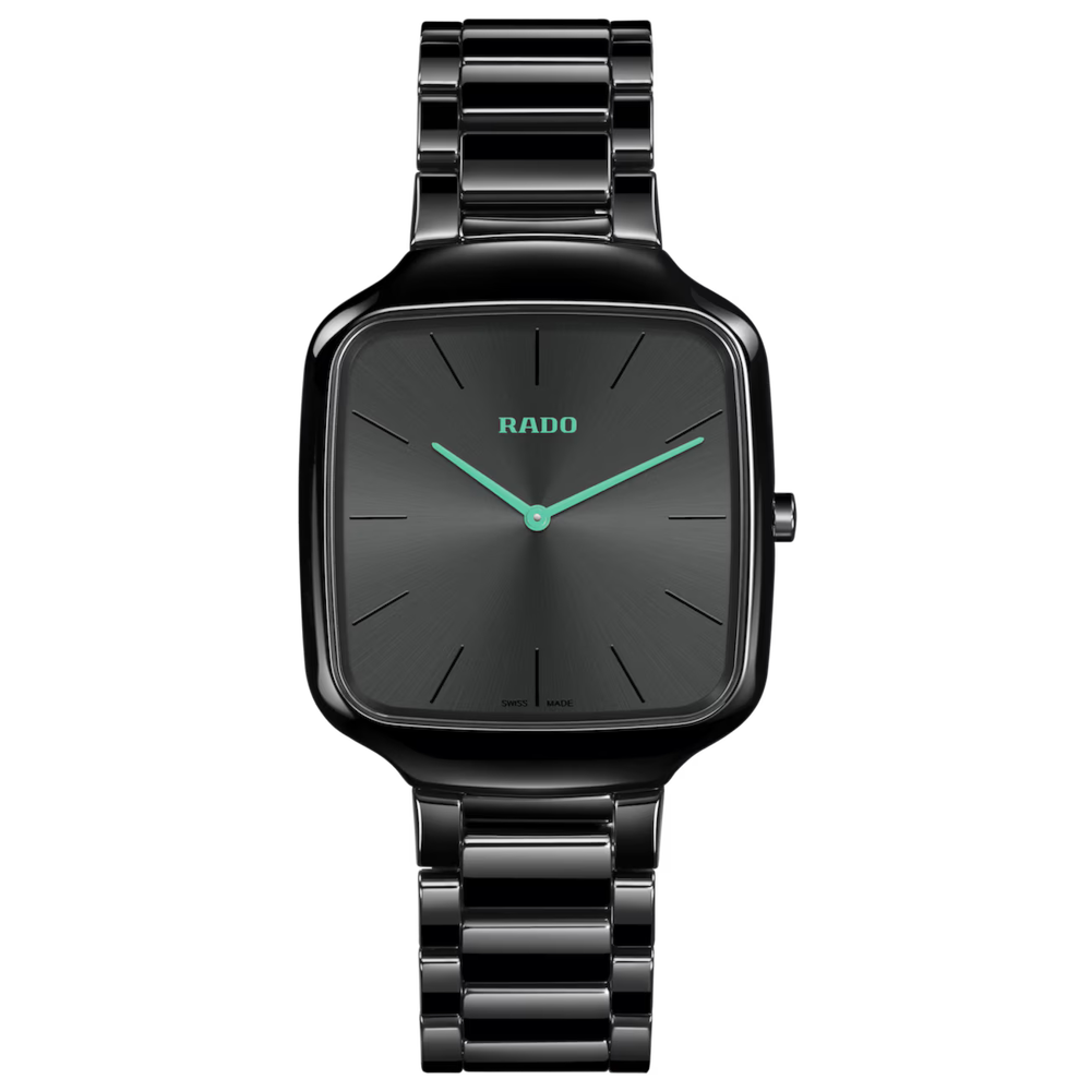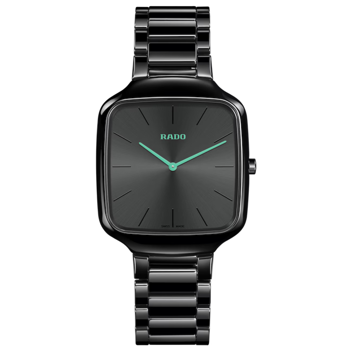 L'orologio Rado True Square Thinline coniuga con armonia espressione artistica e precisione svizzera. L'affidabile movimento Rado calibro R420 al quarzo ne fa un orologio preciso nel misurare il tempo, dall'eleganza disinvolta. I 37 mm della cassa ne sottolineano il perfetto equilibrio tra stile e indossabilità, rendendolo adatto ad ogni occasione. La corona e la cassa in ceramica hi-tech lucida di colore nero sfoggiano un'estetica audace e contemporanea, che incarna l'essenza del design moderno. Con una struttura monoblocco e un cristallo zaffiro piatto, è un modello che si contraddistingue per la resistenza e l'eleganza senza tempo. Il quadrante presenta una finitura nera spazzolata soleil tono su tono con lancette laccate turchesi e logo Rado stampato turchese. Frutto di un lavoro di precisione, il bracciale in ceramica high-tech lucida di colore nero si abbina alla cassa creando un'estetica omogenea che esprime continuità.
