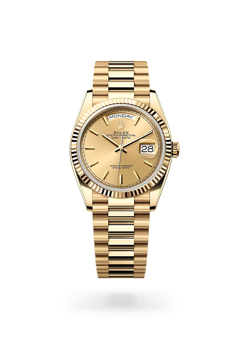 La lunetta zigrinata è un tratto distintivo degli orologi Rolex. La lunetta zigrinata dell’Oyster aveva in origine una funzione: serviva ad avvitarla alla cassa, contribuendo così a garantire l’impermeabilità dell’orologio. La zigrinatura era, di conseguenza, l’esatta riproduzione di quella del fondello che, per le stesse ragioni, veniva avvitato alla cassa con degli appositi strumenti Rolex. Col tempo la zigrinatura si è trasformata in un elemento estetico, un segno distintivo di Rolex che per questo Day-Date 36 è disponibile in oro.
