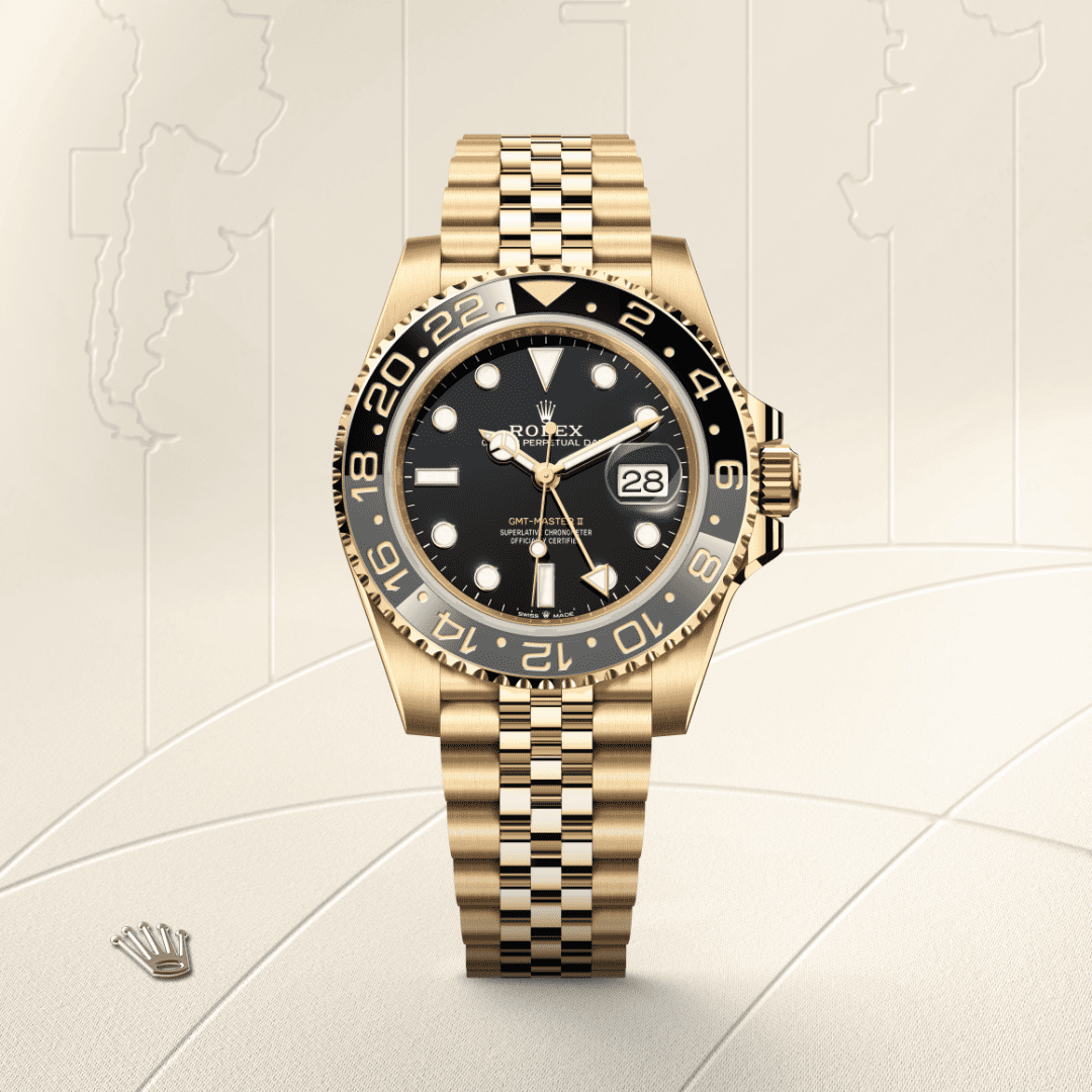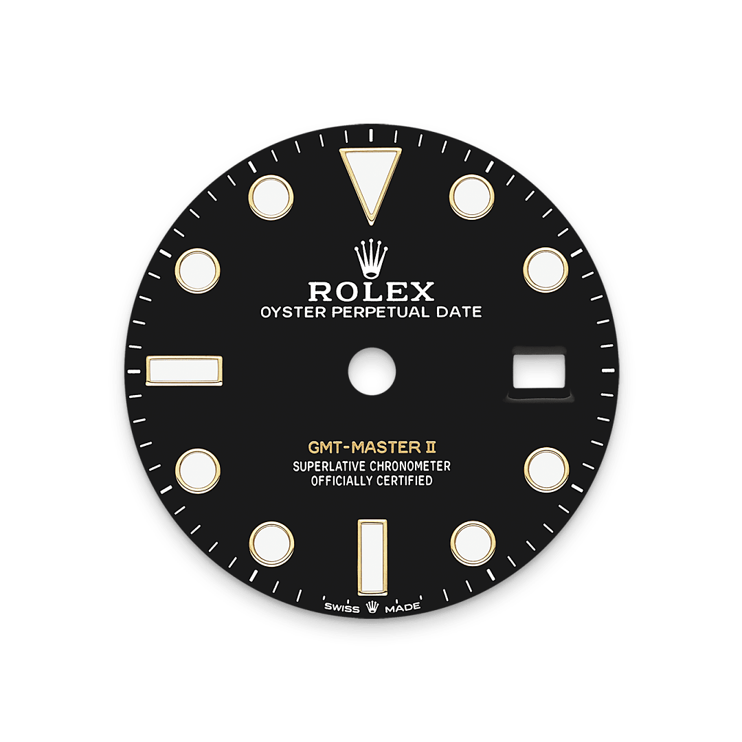 Questo modello presenta un quadrante nero e un disco della lunetta Cerachrom bicolore in ceramica grigia e nera. A completamento delle tradizionali lancette delle ore, dei minuti e dei secondi, il GMT?Master II esibisce una lancetta supplementare con punta a triangolo che effettua un giro del quadrante in 24 ore, così come una lunetta girevole bidirezionale graduata 24 ore. Questa lancetta 24 ore dal colore intenso indica l’ora di riferimento di un primo fuso orario di origine, leggibile sulla graduazione della lunetta. In viaggio, l’ora locale è indicata sul quadrante tramite la tradizionale lancetta delle ore che può essere regolata con facilità, in entrambe le direzioni e a salti di un’ora, grazie a un meccanismo comandato dalla corona di carica. La regolazione dell’ora locale avviene in modo indipendente dalla lancetta dei minuti e dei secondi. Ciò permette ai viaggiatori di regolare il nuovo fuso orario senza dover rinunciare alla precisione del loro orologio.