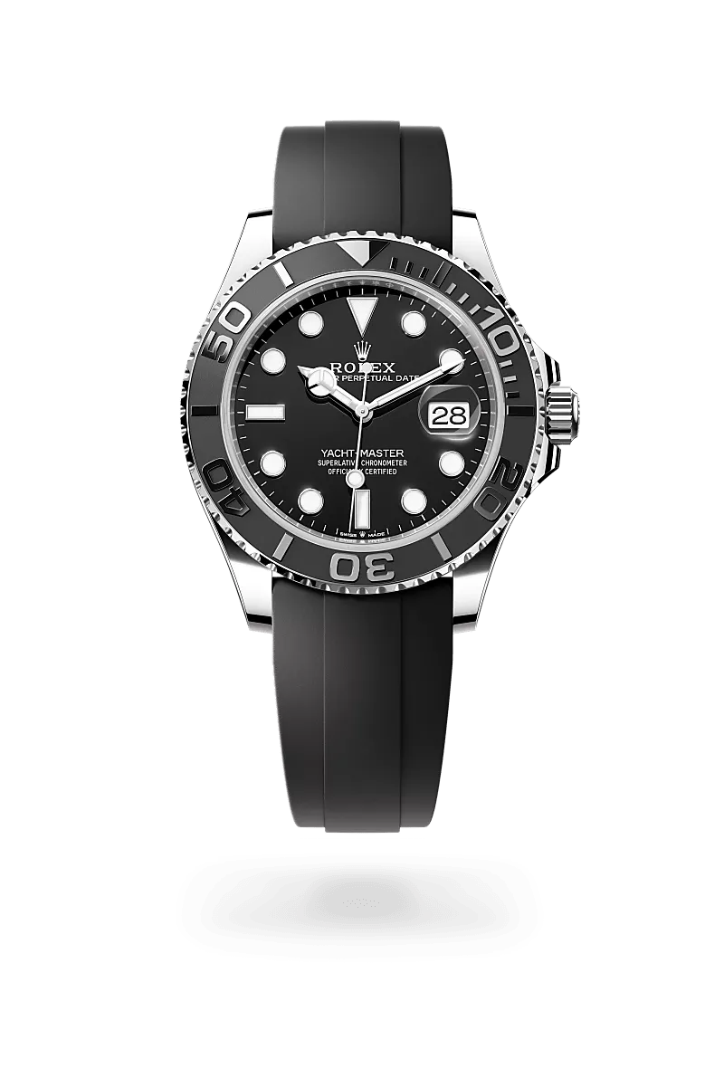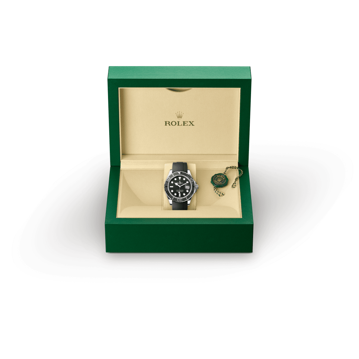 Il nuovo bracciale Oysterflex dello Yacht?Master, sviluppato da Rolex e brevettato, rappresenta un’alternativa sportiva ai bracciali in metallo. La cassa e il fermaglio di sicurezza Oysterlock sono uniti a entrambe le parti del bracciale da una lama metallica realizzata in una lega di titanio e nichel che garantisce una grande flessibilità. La lama è rivestita di un elastomero nero ad alte prestazioni, particolarmente resistente alle aggressioni esterne, di lunga durata e delicato sulla pelle. Per un maggiore comfort, il bracciale Oysterflex è dotato sulla superficie interna di un sistema brevettato di “cuscini” laterali che stabilizzano l’orologio al polso e di un fermaglio di sicurezza Oysterlock in Oro bianco 18 ct. Dispone, inoltre, del sistema di allungamento Rolex Glidelock, sviluppato dal Marchio e brevettato. Questo ingegnoso dispositivo a cremagliera, integrato al fermaglio, permette, senza l’ausilio di alcuno strumento, di regolarne con precisione la lunghezza di circa 15 mm con incrementi di circa 2,5 mm.