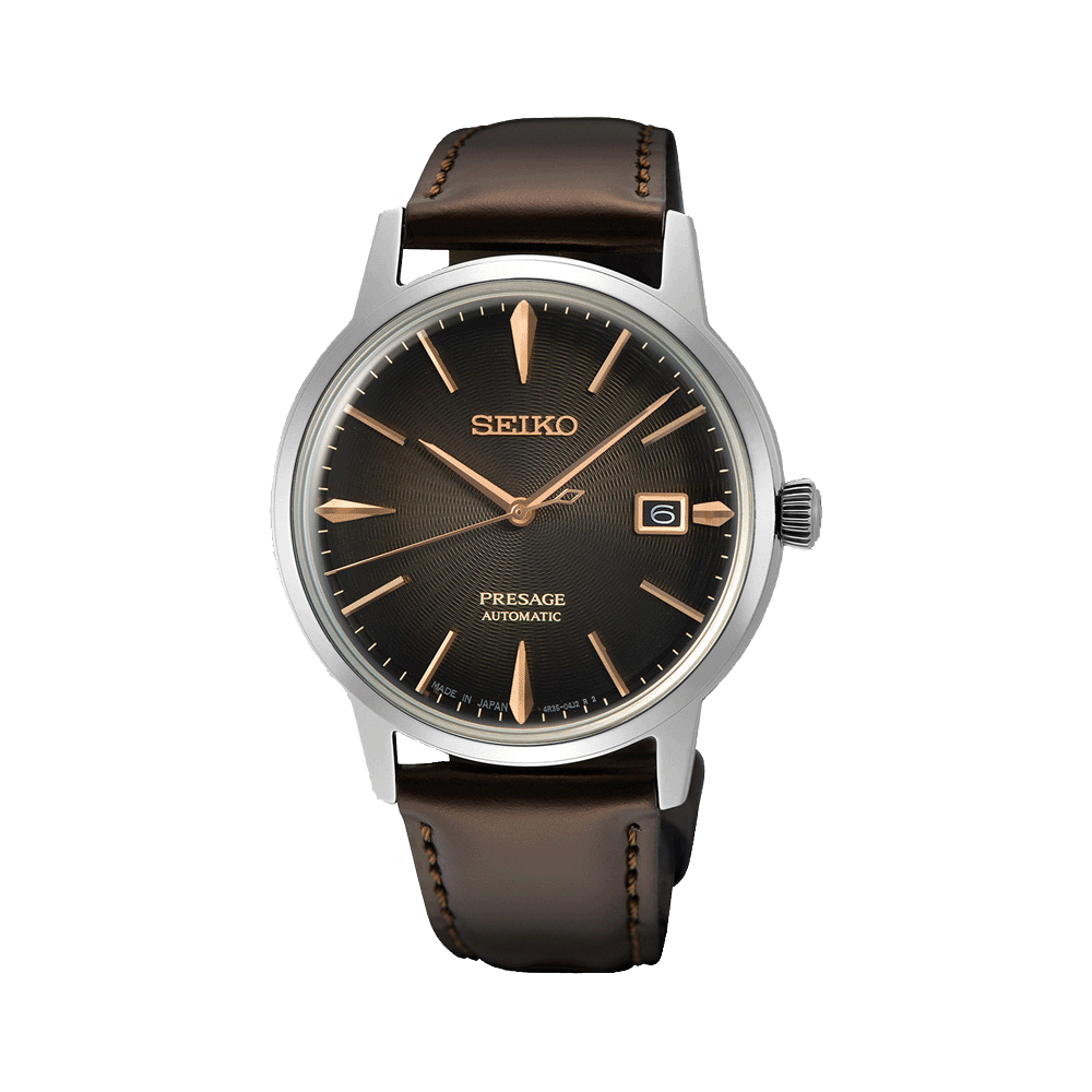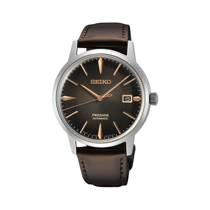 L'orologio SRPJ17J1 della collezione Presage Cocktail è facilmente riconoscibile per il suo quadrante marrone testurizzato. Si ispira al caffè irlandese Cocktail e il suo motivo è ispirato alla luce che passa attraverso i vecchi bicchieri Cocktail. Accompagnato da un cinturino in pelle marrone per un look elegante ma confortevole, questo orologio automatico è perfetto per ogni occasione.
