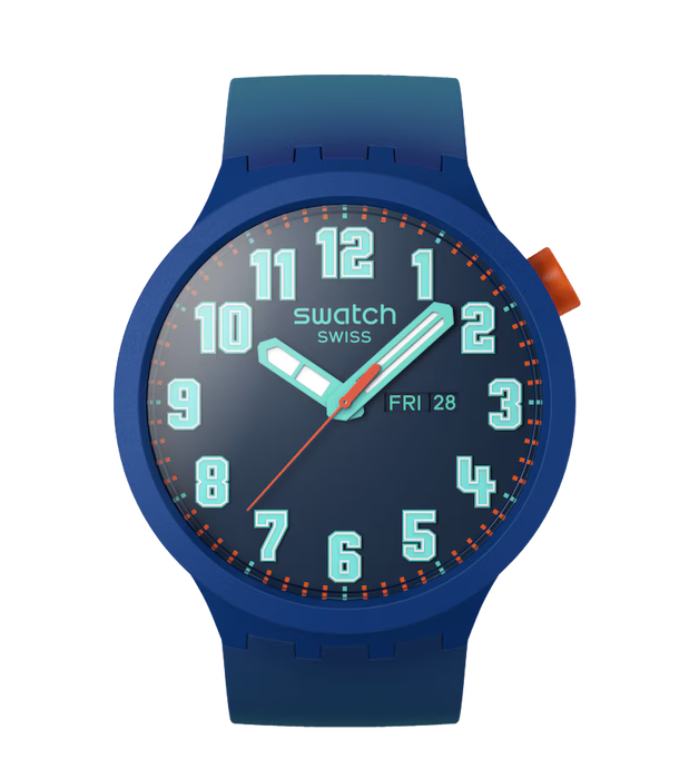 Questo orologio oversize si distingue per il quadrante blu scuro con numeri turchesi in 3D, una minuteria stampata in turchese e rosso e un datario blu scuro con stampa turchese a ore 3. Le lancette delle ore e dei minuti turchese con effetto fosforescente e la lancetta dei secondi rossa indicano l'ora. La cassa blu opaco e la lunetta abbinata sono completate da un cinturino blu scuro e turchese opaco e sfumato, con passanti blu opaco e una mezza fibbia blu opaco.