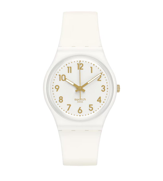 Il quadrante bianco di questo orologio minimalista è caratterizzato da lancette e numeri color oro, cassa bianca e cinturino bianco abbinato.