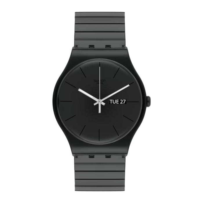 Il discreto MYSTERY LIFE (SUOB708) ha un cinturino flessibile nero lucido e un quadrante spazzolato nero dotato di datario con giorno e data e dettagli neri quasi invisibili.