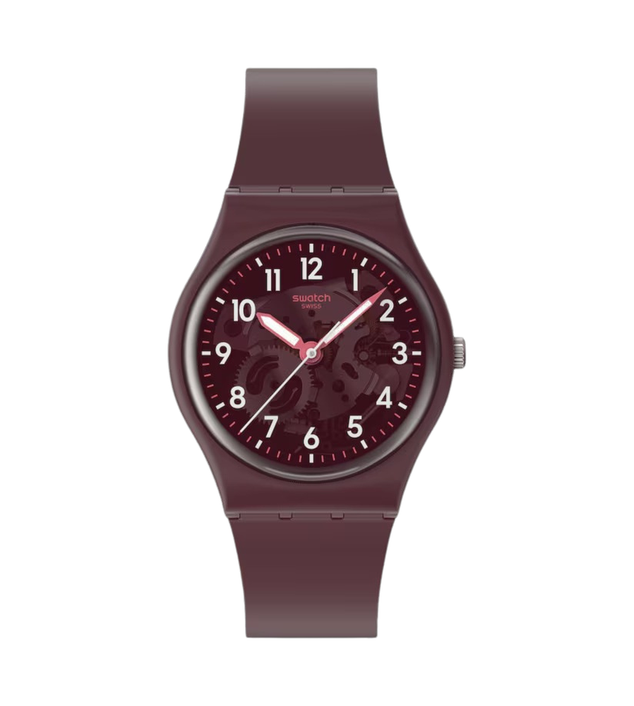 Questo orologio ha un quadrante bordeaux trasparente che lascia intravedere il movimento e presenta numeri bianchi e una minuteria rosa, lancette delle ore e dei minuti rosa che si illuminano al buio e una lancetta dei secondi bianca, il tutto protetto da un vetro biosourced. Completano il look la cassa, il cinturino, il passante e la fibbia biosourced abbinati in color bordeaux opaco.