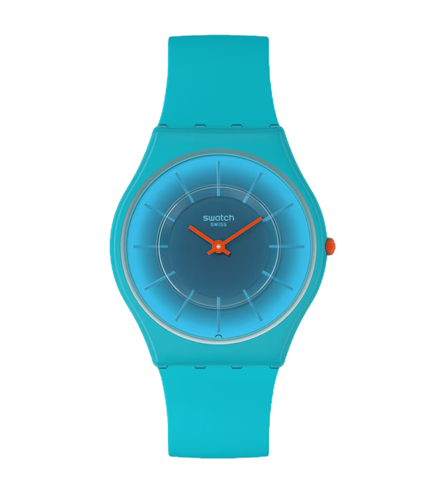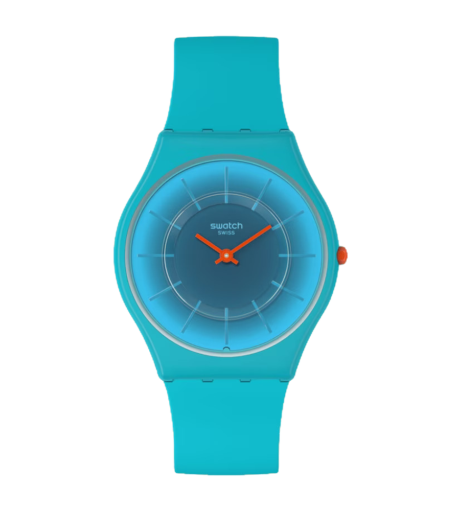 Questo orologio ultrasottile biosourced è dotato di quadrante sfumato, indici, passante e fibbia azzurra su cassa e bracciale blu turchese. Le lancette e la corona arancioni aggiungono un divertente contrasto a questo orologio blu.