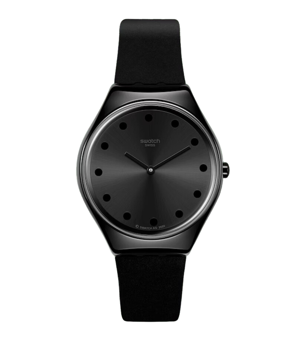Questo elegante SKIN IRONY si contraddistingue per il cinturino in pelle Nubuck e la cassa nera brillante in PVD. Il quadrante nero spazzolato soleil mette in evidenza i dodici cristalli neri applicati direttamente sul vetro.