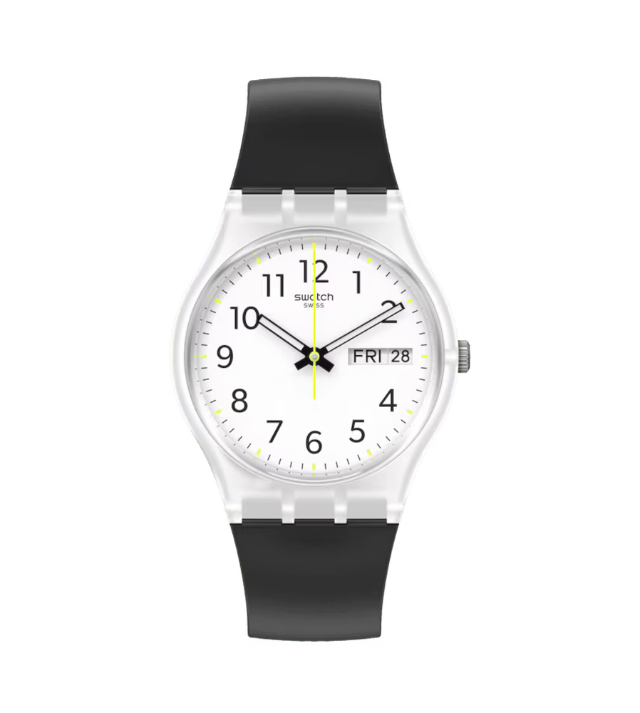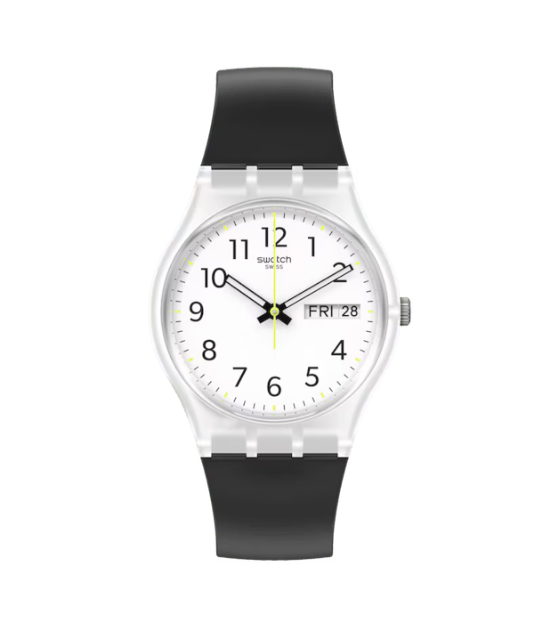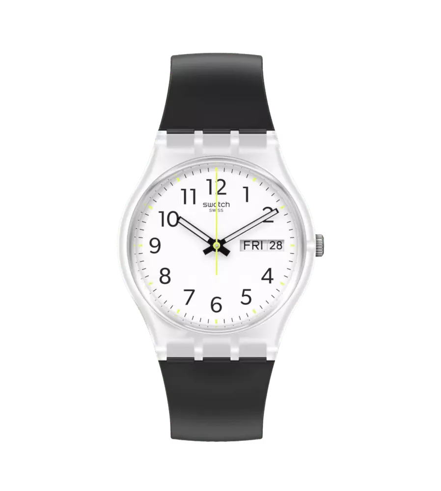 Una cassa trasparente apporta luminosità e un fascino senza tempo a questo nuovo modello opaco. Lancette che si illuminano al buio e un cinturino in materiale di origine biologica rendono il modello un guardiano della notte.