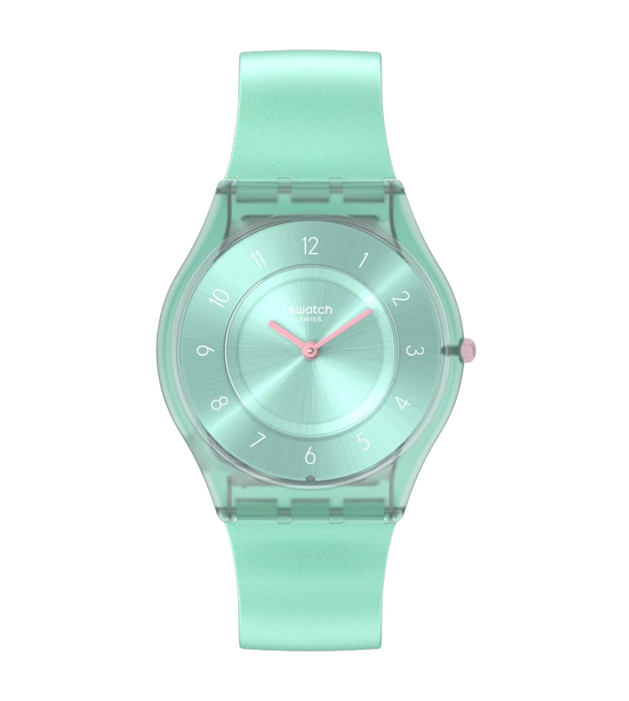 Questo SKIN CLASSIC BIOSOURCED ultra sottile crea un effetto elettrizzante sul cinturino di silicone verde semitrasparente e una fibbia di plastica. Il cuore di questo orologio elegante e minimal è un quadrante verde con stampa verde, lancette rosa e vetro biosourced.