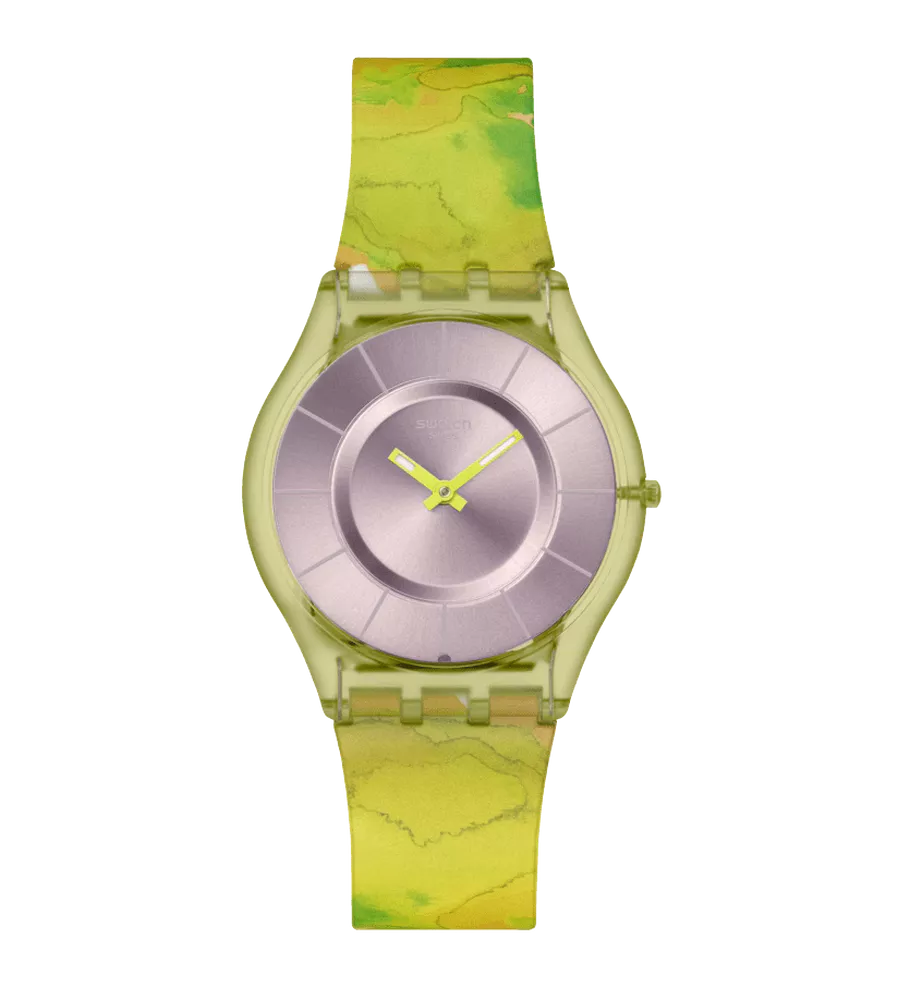 Orologio Swatch Skin ultrasottile e ultraleggero con quadrante beige effetto soleil, indici beige chiaro e lancette verdi luminescenti, vetro biosourced, cassa in materiale biosourced verde chiaro trasparente opaco, cinturino coordinato con stampa multicolore, fibbia e passante dello stesso colore.
