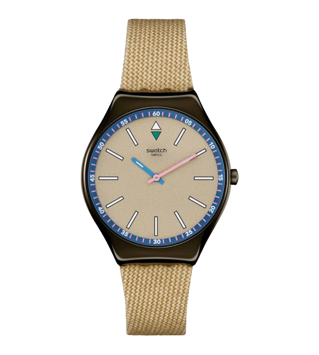 Questo orologio ultrapiatto in acciaio inossidabile con rivestimento in PVD grigio presenta un quadrante beige con stampa bianca e rosa e indici fosforescenti con innovativi dettagli 3D. Il cinturino in tessuto beige presenta una fibbia in acciaio inossidabile con PVD grigio e un passante in tessuto beige.