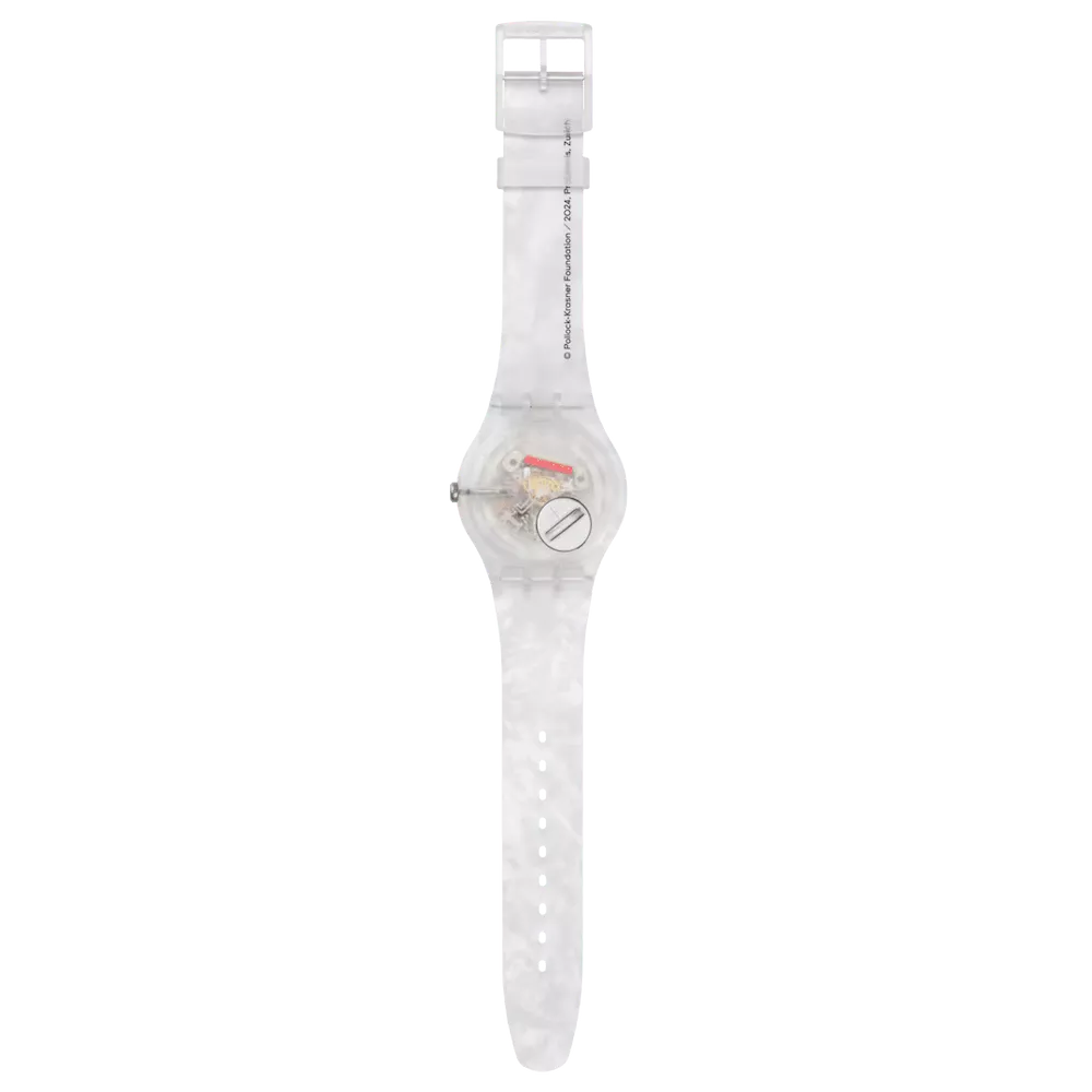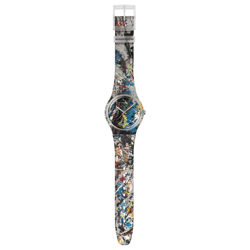 Lo Swatch x Guggenheim con grafica “Alchemy” di Jackson Pollock stampata su quadrante, cassa e cinturino trasparenti opachi. Lancette argentate luminescenti e lancetta dei secondi arancione a contrasto per una lettura immediata. Cassa da 41 mm, spessore 9,85 mm e distanza ansa-ansa 47,40 mm. Cinturino in silicone con passante logato Guggenheim e fibbia in polimero, per uno stile artistico e contemporaneo.