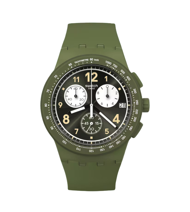 Questo cronografo verde cachi scuro presenta un quadrante nero spazzolato soleil con lancette delle ore e dei minuti nere che si illuminano al buio, una lancetta bianca dei secondi e una finestra della data a ore 3. Questo orologio ha una lunetta verde con una stampa bianca su cassa verde opaco e cinturino, passante e fibbia coordinati.