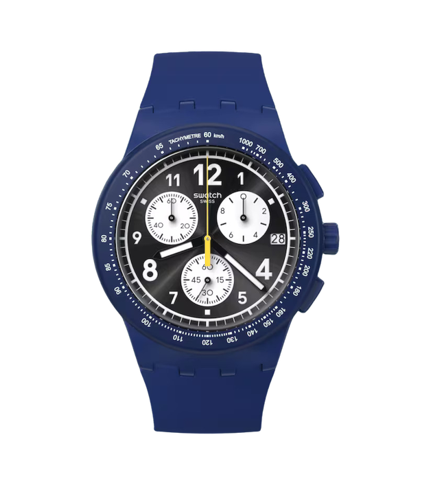 Questo cronografo blu scuro presenta un quadrante nero spazzolato soleil con lancette delle ore e dei minuti nere che si illuminano al buio, una lancetta dei secondi gialla e una finestra della data a ore 3. Questo orologio ha una lunetta blu scuro con stampa bianca su una cassa blu scuro opaca e cinturino, passante e fibbia coordinati.