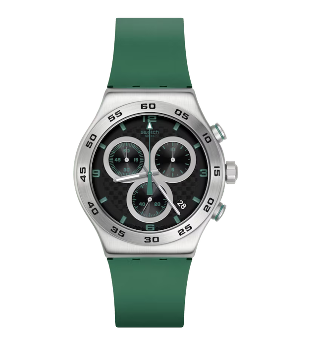 Questo orologio cronografo in acciaio inossidabile ha un sofisticato stile urban-chic. Il quadrante nero presenta un effetto unico in fibra di carbonio e una stampa verde. La cassa e la fibbia in acciaio inossidabile spazzolato, abbinate a un cinturino e un passante in gomma verde opaca, sono l'essenza della bellezza.