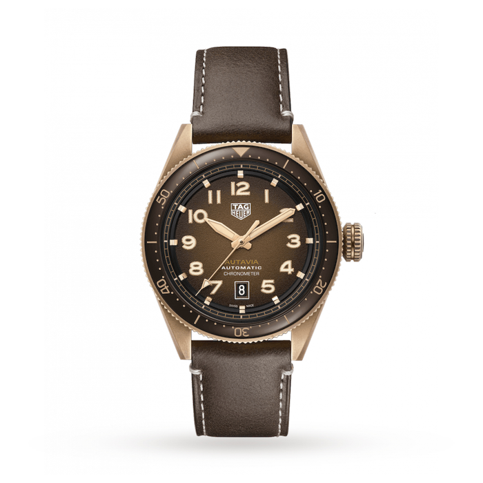 Un orologio da uomo sobrio e automatico ispirato agli orologi da pilota vintage, con cassa in bronzo e quadrante fumé marrone cioccolato. Il design vintage è rinforzato da materiali avanzati, tra cui titanio per il fondello e ceramica marrone per la ghiera girevole bidirezionale.