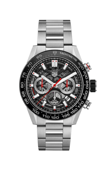 Questo modello TAG Heuer Carrera è animato dallo straordinario movimento di manifattura Heuer 02, con 80 ore di riserva di carica. Questo segnatempo inoltre presenta un quadrante nero, una cassa da 45 mm in acciaio e una lunetta fissa con scala tachimetrica in ceramica nera. I contatori azzurrati a ore 3, 6 e 9 sono rodiati con lancette laccate rosse.