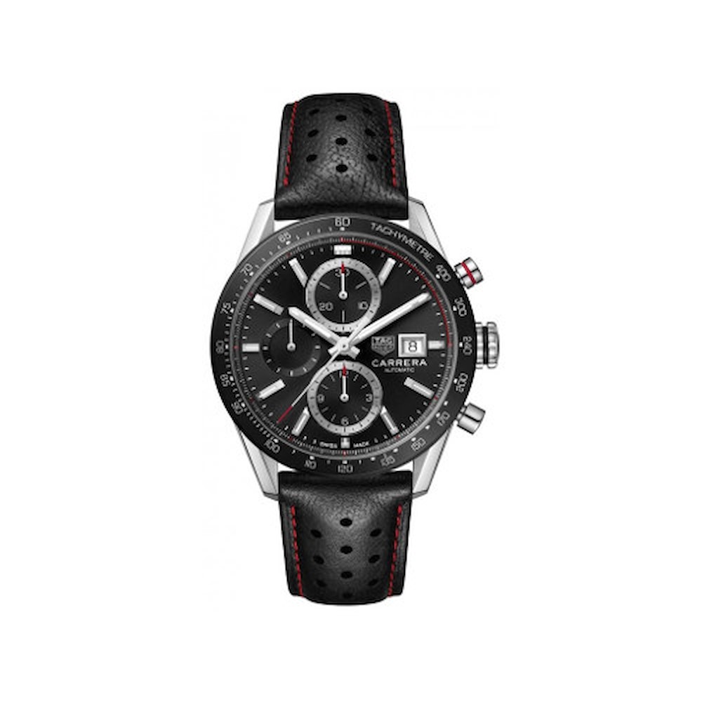 Un cronografo sportivo TAG Heuer Carrera dotato del movimento automatico Calibre 16. La lunetta fissa in ceramica nera con scala tachimetrica riflette le sue origini legate ai box e paddock dei circuiti automobilistici.