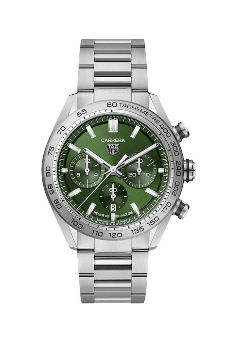 Un cronografo TAG Heuer Carrera con tutto il prestigio di uno stile ispirato al mondo delle corse automobilistiche. Questo modello, che presenta una cassa da 44 mm in acciaio lucido e satinato, è estremamente funzionale, grazie al movimento automatico di manifattura Heuer 02. Il quadrante verde spazzolato è impreziosito da un secondo indicatore e due contatori cronografici verdi, per il massimo delle performance.