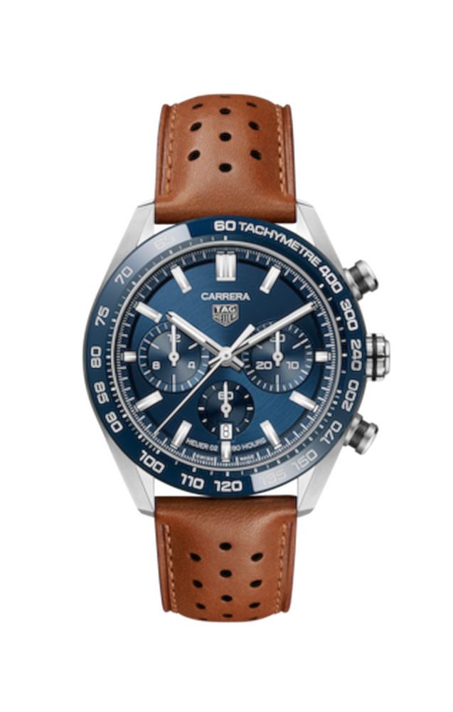 Il design inconfondibile di questo lussuoso TAG Heuer Carrera è guidato alla precisione, grazie al cinturino in pelle di vitello marrone traforato e con accenti blu abbinati al quadrante e alla lunetta.