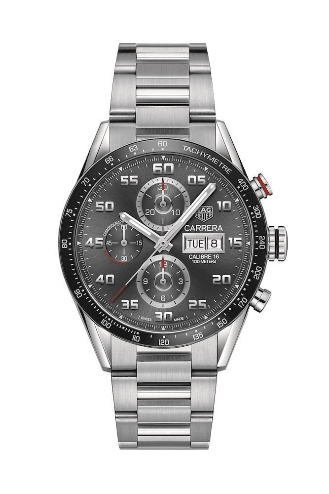 Un cronografo da corsa unico di colore grigio, dotato di bracciale con maglie ad H in acciaio inossidabile dalle squisite finiture. Il quadrante color antracite è evidenziato da tocchi di rosso e argento e da finiture azzurrate su due dei contatori.