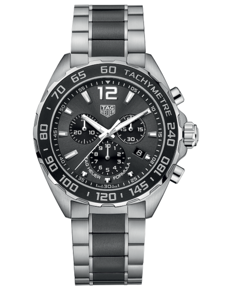 Quadrante grigio argentato con indici luminosi, lunetta fissa in ceramica con scala tachimetrica, impermeabile fino a 200 metri: un cronografo di precisione ispirato all'impegno profuso costantemente da TAG Heuer nelle gare di Formula 1.