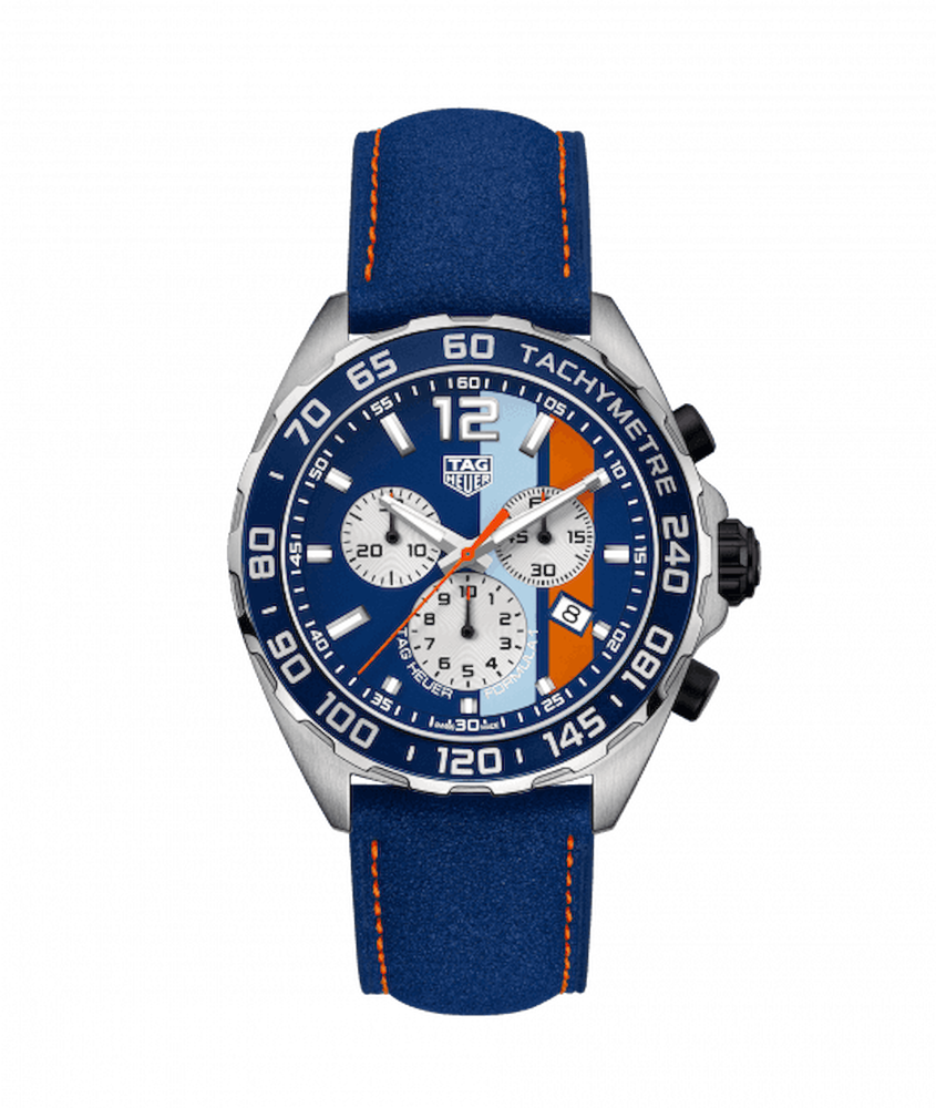 l cronografo automatico TAG Heuer Gulf Formula 1 è un potente omaggio a due dei più grandi e leggendari sponsor delle corse automobilistiche. Il quadrante spazzolato con scudo blu Gulf sfoggia le righe blu e arancioni del marchio, come la vettura di Steve McQueen nel classico cinematografico del 1971, "Le 24 ore di Le Mans".