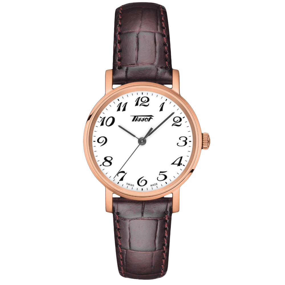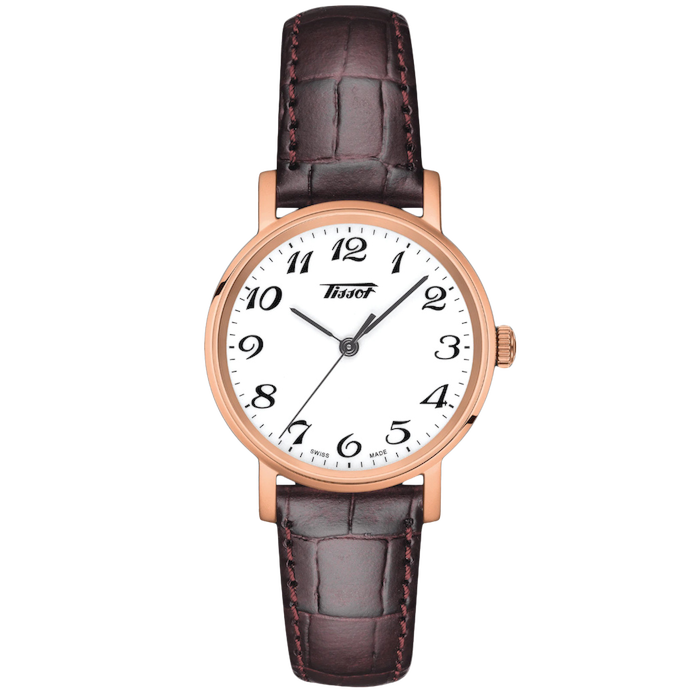 Orologio Tissot da polso per donna con cassa in acciaio con trattamento in PVD rosa di diametro 30 mm. Il quadrante di questo orologio da donna Tissot è bianco con vetro zaffiro antigraffio. Lunetta (ghiera) liscia in acciaio in PVD rosa. Bracciale in pelle marrone effetto alligatore con chiusura farfalla. Resistente all'acqua (Water Resistant) 3 atmosfere (30metri). Movimento al quarzo Swiss Made. Funzione solo tempo
