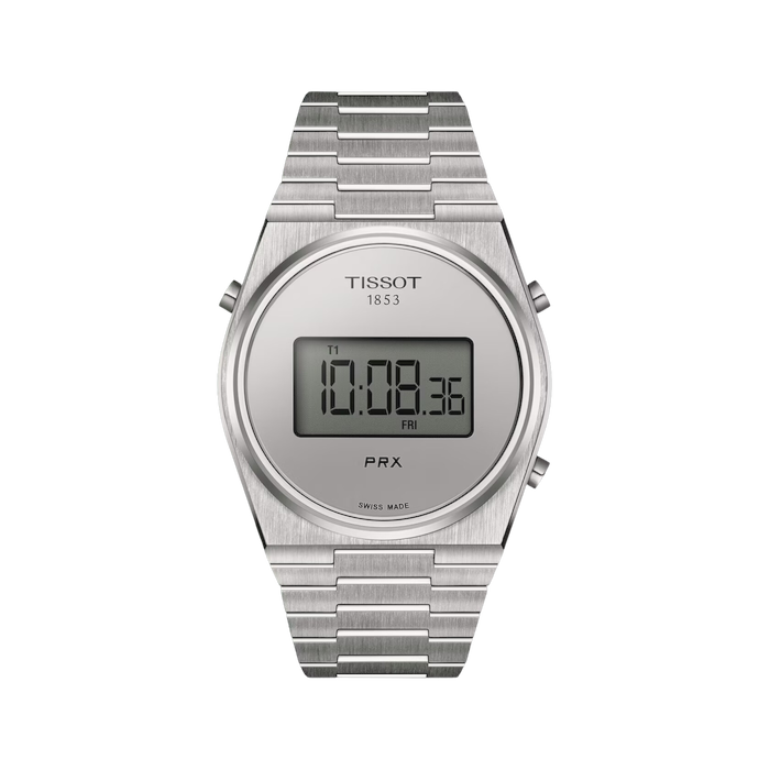 Il Tissot PRX Digital, un mix armonioso dell'iconico design PRX del 1978 e del Tissot Digital Quartz (Calibr o4012), mostra brillantemente un ibrido di epoche passate e influenze digitali. Unendo perfettamente l'estetica retrò con un tocco contemporaneo, è il segnatempo per i pionieri di oggi. Il PRX Digital, disponibile nelle opzioni da 35 mm e 40 mm e in una varietà di colori, soddisfa tutti i polsi, mentre la moltitudine di funzioni - doppio fuso orario, giorno-data, cronografo e altro ancora - soddisfa tutte le esigenze. Racchiusi da una cassa resistente all'acqua fino a 100 metri e corredati da un bracciale satinato e una chiusura pieghevole a tripla lama, questi segnatempo sono realizzati sia per la resistenza che per il comfort. La collezione Tissot PRX Digital simboleggia un viaggio nel tempo, un omaggio al passato e un brindisi al futuro.