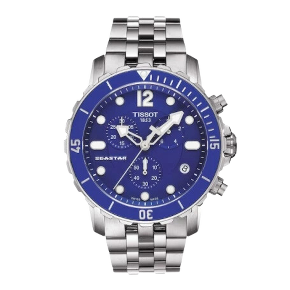 Orologio Seastar 1000 Quartz Chronograph con cassa in acciaio e ceramica e bracciale in acciaio,vetro zaffiro e movimento al quarzo.L’attrezzatura da sub non è mai stata così coordinata, sia esteticamente che dal punto di vista tecnico. Il Tissot Seastar 1000 coniuga stile e prestazioni, senza compromessi. Il mondo delle immersioni si riflette sia nella sua estetica che nelle sue funzionalità. Conserva intatte le sue prestazioni sott’acqua fino a 30 bar (300 m), a dimostrazione della compatibilità tra la passione per gli sport subacquei e il desiderio di un sofisticato movimento automatico svizzero. Il tema delle immersioni ricorre costantemente in elementi come la lunetta unidirezionale, il cinturino con estensione da sub e chiusura di sicurezza oltre al rivestimento in Super-LumiNova® di indici e lancette. Tutti i modelli di questa linea sono dotati di valvola di scarico dell’elio che consente la depressurizzazione automatica dell’orologio. Il Tissot Seastar 1000 ribadisce il talento di Tissot nel racchiudere l’eccellenza funzionale in un design straordinario.
