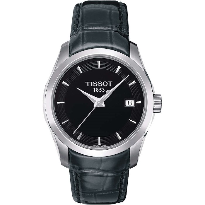 Orologio da polso donna Tissot tondo analogico con vetro in zaffiro antiriflesso. Cassa in acciaio inox di diametro 32mm e spessore 8mm con quadrante nero. Cinturino in pelle nero lunghezza standard larghezza 22mm. Datario e resistenza all'acqua fino a 100m