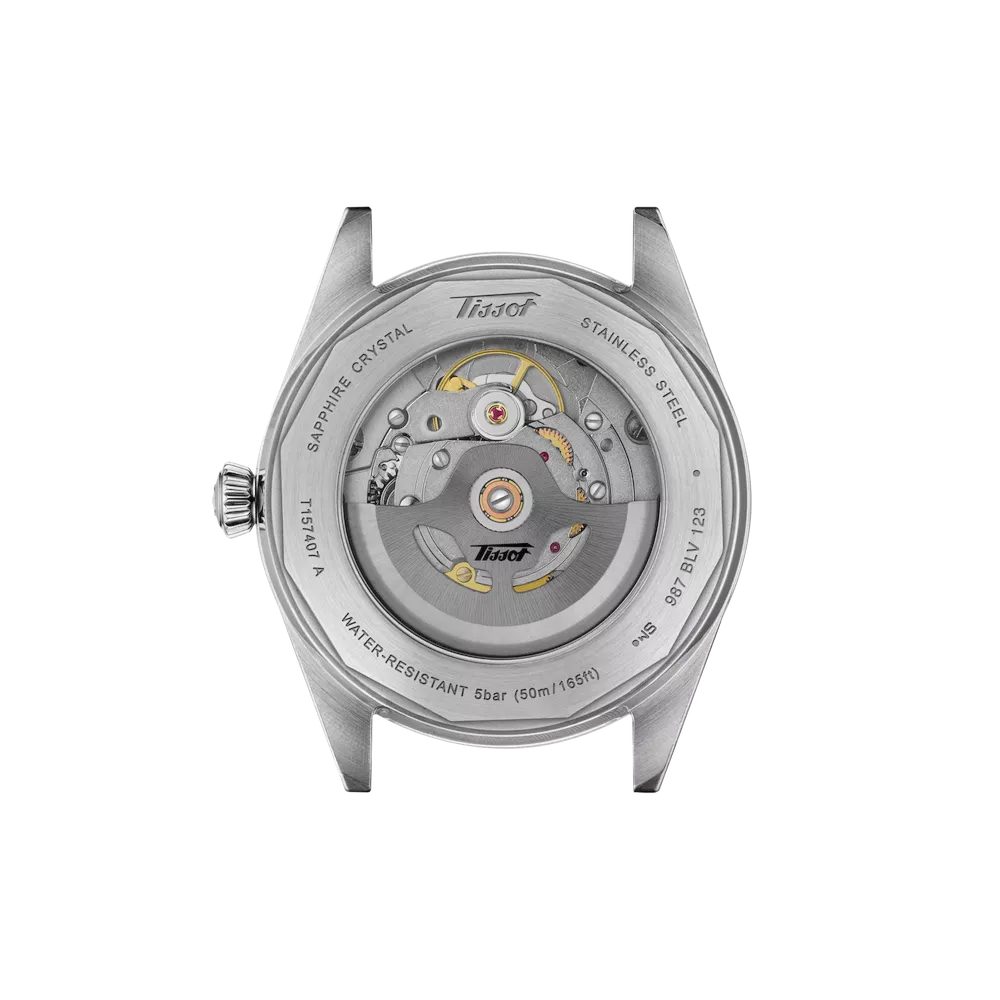 Tissot Visodate automatico con cassa in acciaio inox 316L da 39 mm, riserva di carica fino a 80 ore, fondello trasparente, vetro zaffiro bombato antigraffio con trattamento antiriflesso, cinturino intercambiabile a sgancio rapido.