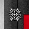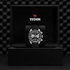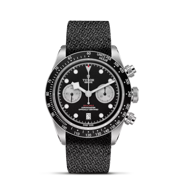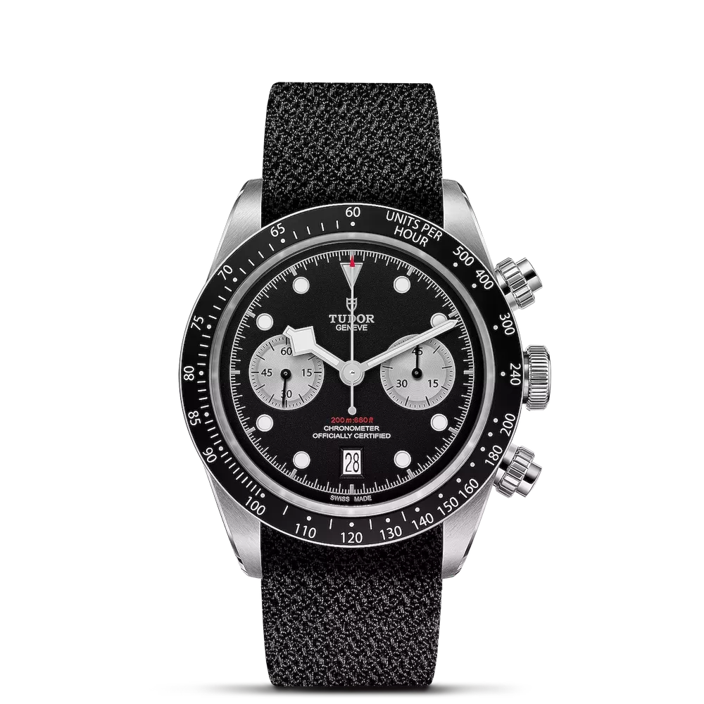 Bracciale: Completa il look sportivo del Tudor Black Bay Chrono il cinturino in tessuto nero, dotato di una fibbia ad ardiglione per una chiusura sicura e regolabile.