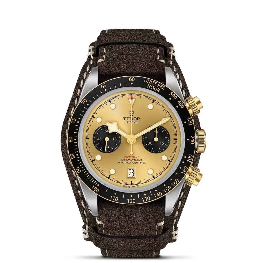 Corona di Carica: La corona di carica a vite presenta la rosa TUDOR in rilievo. I pulsanti a vite sono realizzati in oro giallo massiccio e posizionati alle ore 2 e 4. La corona e i pulsanti sono rivestiti da uno strato di oro giallo di 0,3 mm, aggiungendo un tocco di lusso al design.