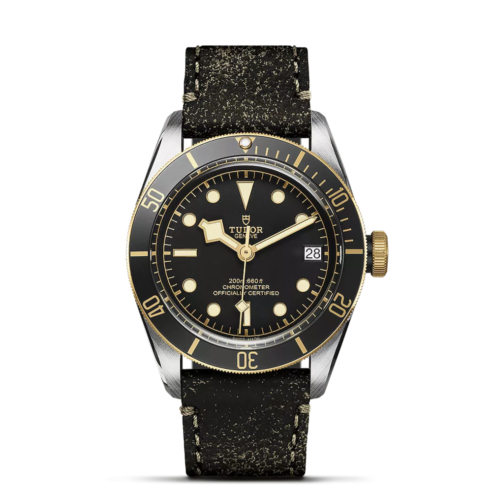 Corona di carica: La corona di carica è a vite e presenta incisa la rosa TUDOR laccata nera. Il tubo della corona è realizzato in alluminio anodizzato nero e l'acciaio è rivestito da uno strato di oro giallo di 0,3 mm, conferendo un tocco di eleganza al design.