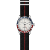 Bracciale: Completa l'estetica sportiva di questo orologio il cinturino in tessuto nero con banda bordeaux, dotato di una fibbia ad ardiglione per una vestibilità sicura e regolabile.