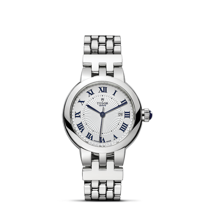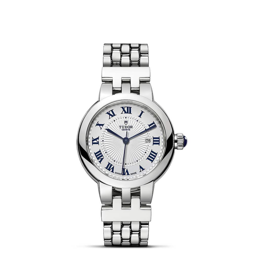 Corona di Carica: La corona di carica a vite in acciaio è decorata con un cabochon blu trasparente, aggiungendo un tocco di colore e stile al design.
