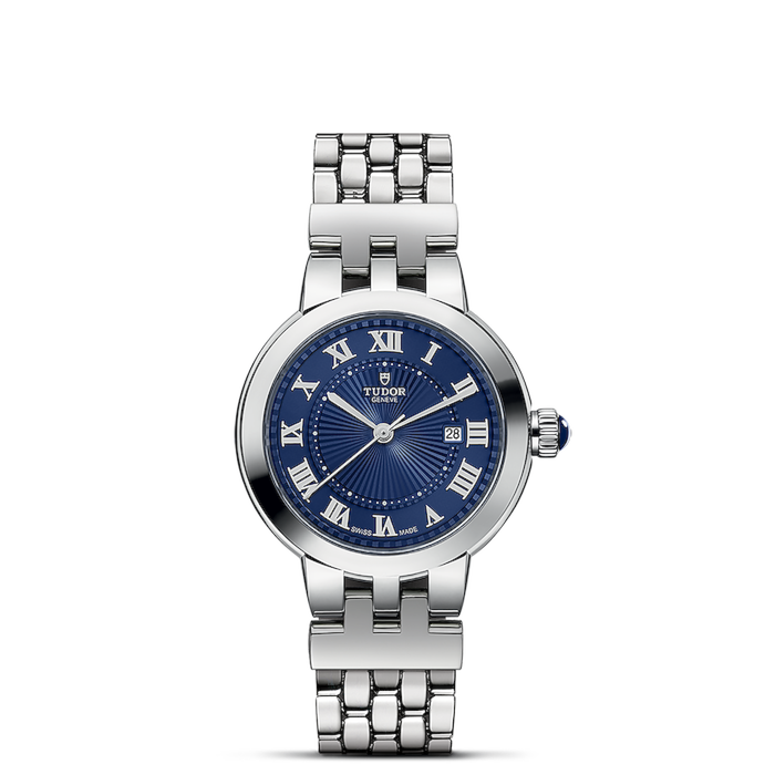Corona di carica: La corona di carica a vite in acciaio, arricchita da un cabochon blu trasparente, non solo aggiunge un tocco di eleganza, ma garantisce anche la resistenza all'acqua fino a 100 metri di profondità.