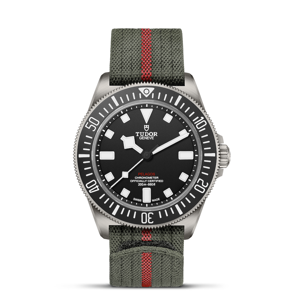 Bracciale: Il cinturino largo 22 mm in tessuto, di colore verde foresta con filo centrale rosso e sistema di chiusura a strappo, aggiunge un elemento di stile distintivo all'orologio. Inoltre, è incluso nell'astuccio un cinturino addizionale in caucciù nero con motivo tessuto e fibbia ad ardiglione in titanio, offrendo versatilità e opzioni di stile aggiuntive.
