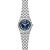 Quadrante blu con finitura soleil, arricchito da numeri romani applicati e datario posizionato a ore 3, per un’estetica classica e funzionale.