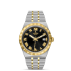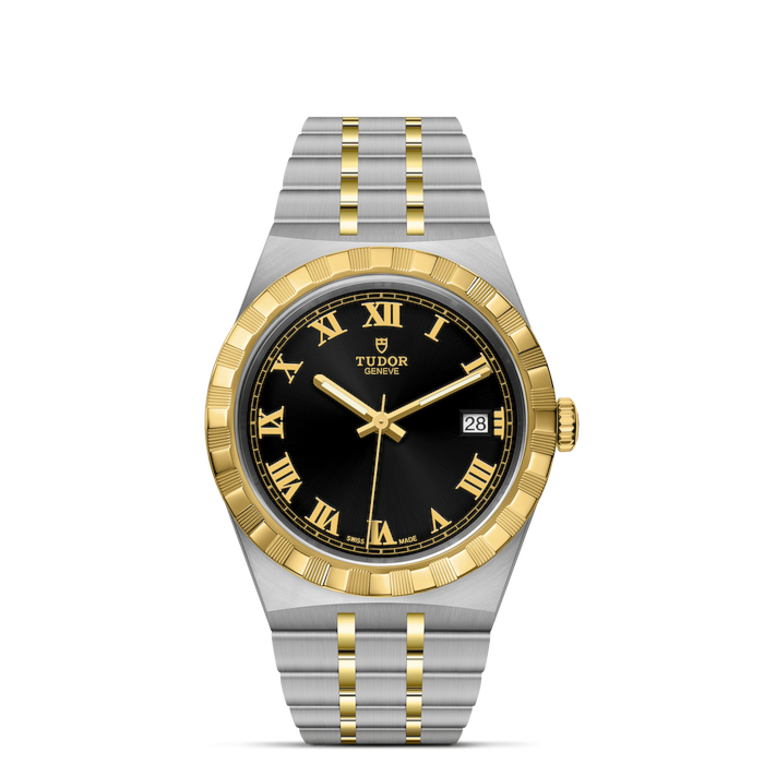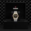 Corona a vite in oro giallo decorata con il logo TUDOR, che contribuisce all’eleganza e all’impermeabilità dell’orologio.