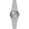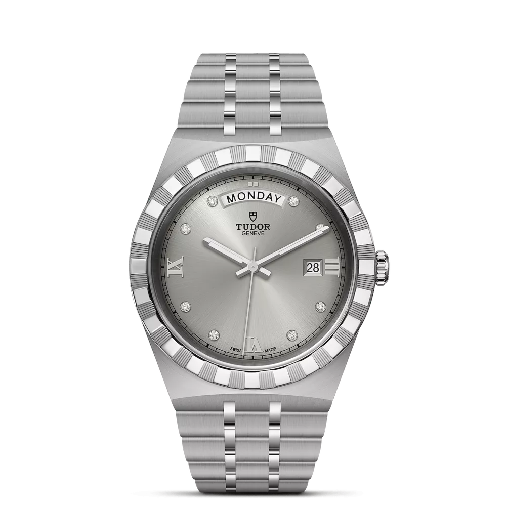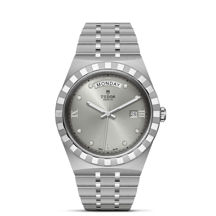 Quadrante: Di colore argento con finitura soleil, il quadrante è impreziosito da diamanti. I numeri romani applicati, il giorno della settimana alle 12 e il datario alle 3 offrono una funzionalità aggiuntiva e un'eleganza classica.