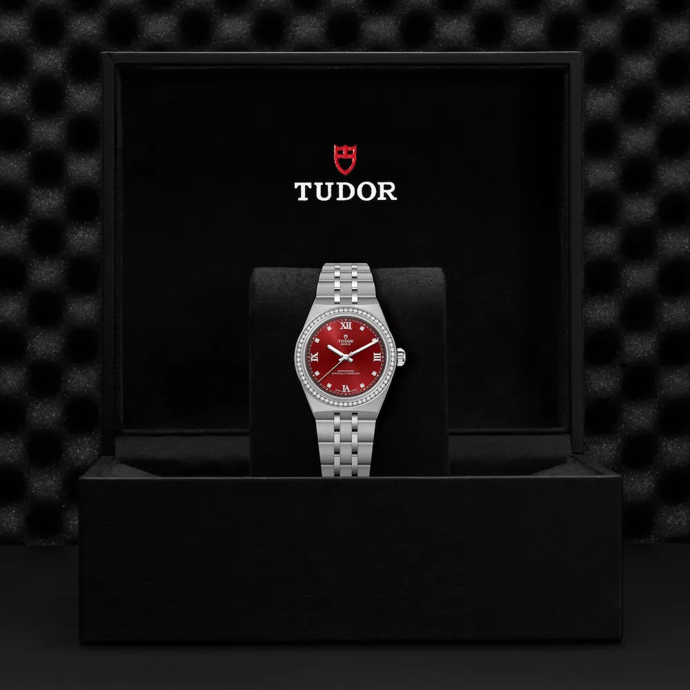 Orologio da 30 mm della collezione Royal, con cassa in acciaio inox e finiture lucide e satinate. Il quadrante bordeaux con numeri romani applicati dona profondità e carattere, mentre la lunetta in acciaio con diamanti aggiunge un tocco prezioso ed elegante. Dotato di movimento automatico di manifattura certificato COSC, offre circa 50 ore di autonomia e impermeabilità fino a 100 metri. Il bracciale integrato in acciaio con chiusura TUDOR “T-fit” completa un design raffinato