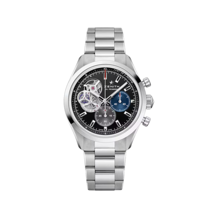 Il CHRONOMASTER Open offre una visuale del cuore pulsante del movimento El Primero attraverso il quadrante. Corredata da un’elegante cassa in acciaio da 39,5 mm, questa versione presenta un quadrante nero opaco con contatori di tre colori e un contatore trasparente per i secondi continui, oltre a un bracciale integrato in acciaio. Animato dal movimento cronografico automatico El Primero 3604 con precisione al 1/10 di secondo.