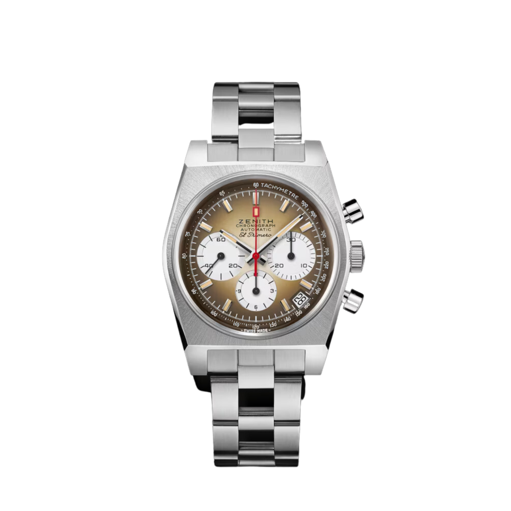 Un’accurata e moderna rivisitazione dell’A385 del 1969, uno dei primi orologi in acciaio ad alloggiare il calibro cronografico automatico El Primero, con cassa tonneau da 37 mm e quadrante sfumato dai toni caldi che si scuriscono verso i bordi. Abbinato a un bracciale in acciaio effetto “scala”.